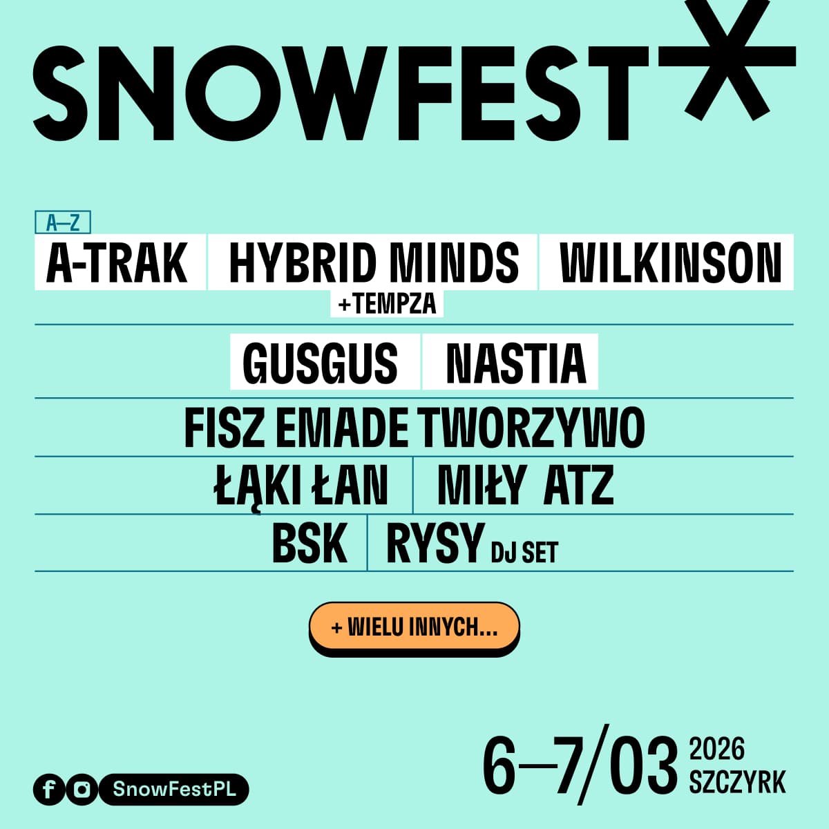 A-Trak, Hybrid Minds, Wilkinson, Nastia, GusGus, Fisz Emade Tworzywo, RYSY, Miły ATZ, Łąki Łan oraz BSK — takie zestawienie artystów idealnie oddaje ducha SnowFest Festival. Zimowa sceneria Szczyrku stanie się tłem dla muzyki, która łączy pokolenia i gatunki, od hipnotycznej elektroniki, przez basową energię drum’n’bassu, po alternatywne polskie brzmienia. To właśnie ta różnorodność sprawia, że SnowFest od lat wyróżnia się na festiwalowej mapie Polski.